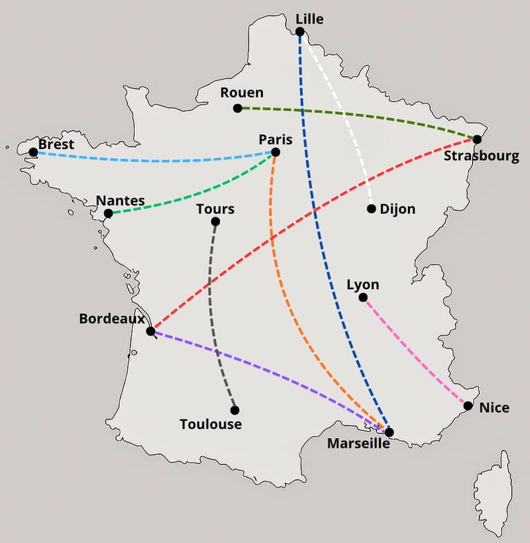 Notre carte des trajets incontournables met en lumière l’expertise de nos équipes sur l’ensemble du territoire, y compris sur les grandes distances dont nous avons fait notre spécialité. En regroupant les liaisons les plus sollicitées au prix le plus avantageux, nous vous offrons un convoyage fiable, précis et parfaitement maîtrisé.